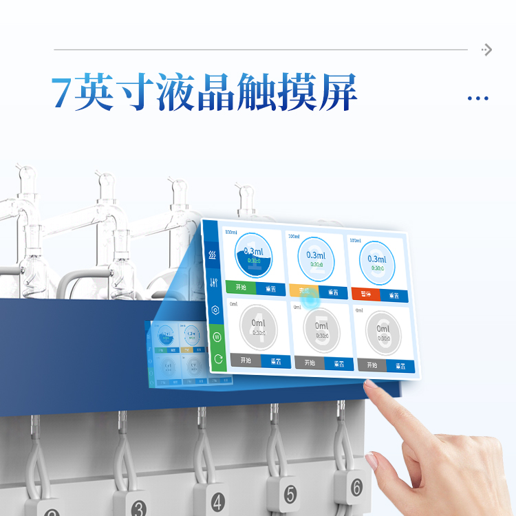 3.智能触控:7寸液晶触摸屏,支持自定义保存最多1000种蒸馏方法,内置18种国标方法。