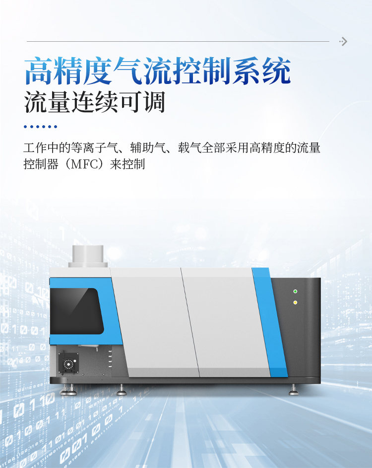 仪器工作中的等离子气、辅助气、载气全部采用高精度的质量流量控制器(MFC)来控制,具有流量连续可调、输出气流的精度高,保证了测试数据的准确性。