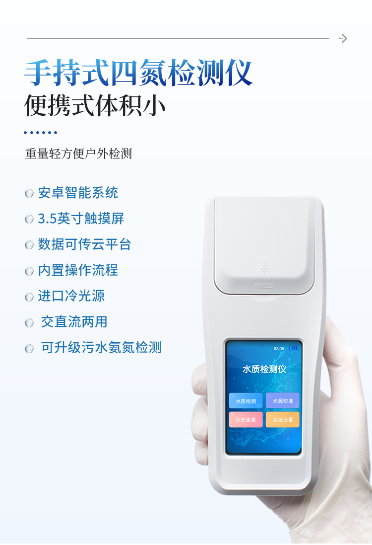 简要描述: 水质四氮检测仪是参考相关标准研发设计制造,本仪器主要检测水质氨氮、硝酸盐氮、亚硝酸盐氮、总氮浓度指标,兼具智能数据分析功能,图表、列表显示数据,分析一目了然;高清晰度彩色液晶触摸显示屏,Android智能操作系统,中文显示界面,中英文键盘,人性化操作,使用更简单。