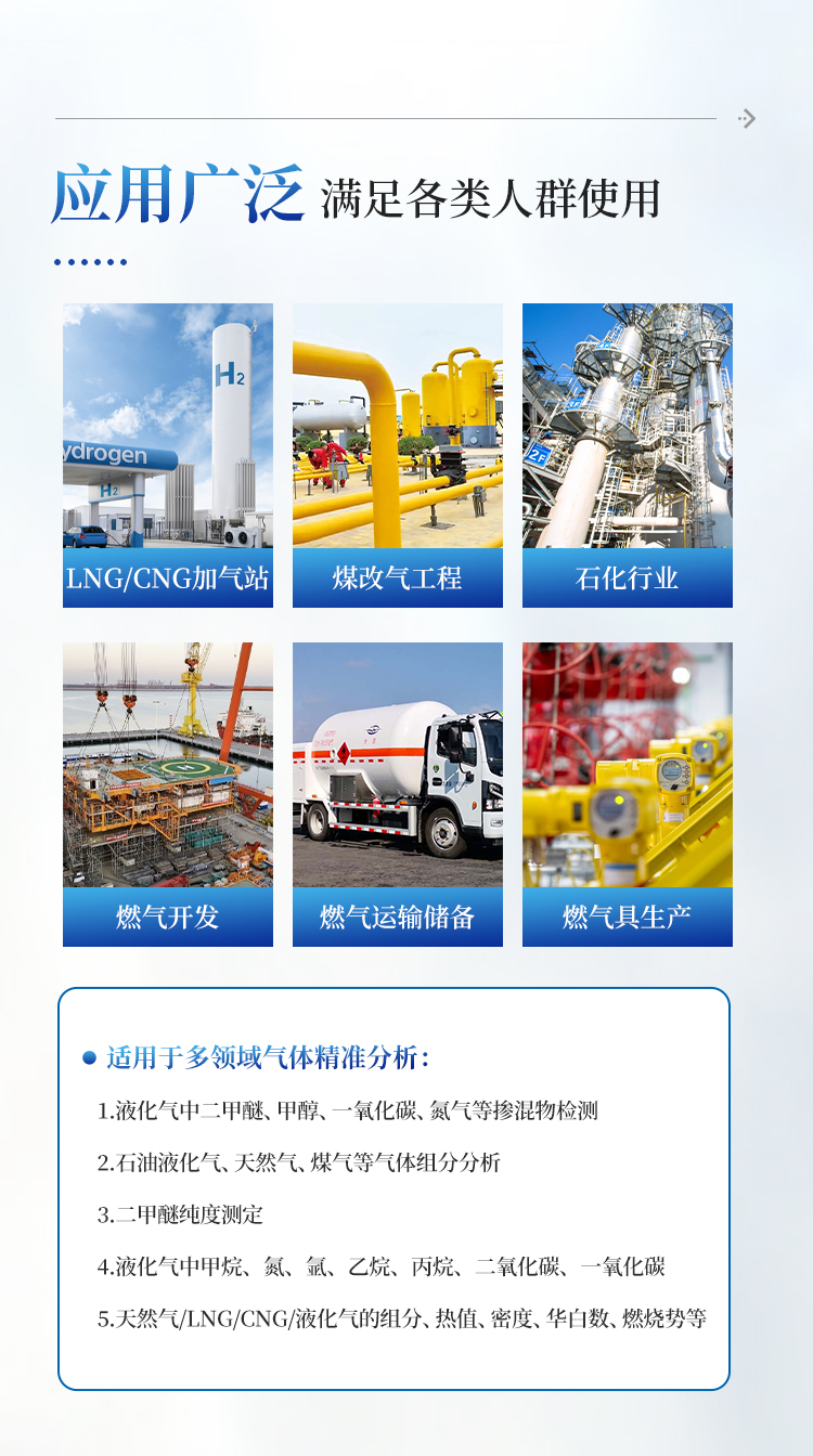 1.石油液化气中二甲醚 、 甲醇 、 一氧化碳 、 氮气等添加气体含量 2.石油液化气 、 天然气 、 煤气等气体组分