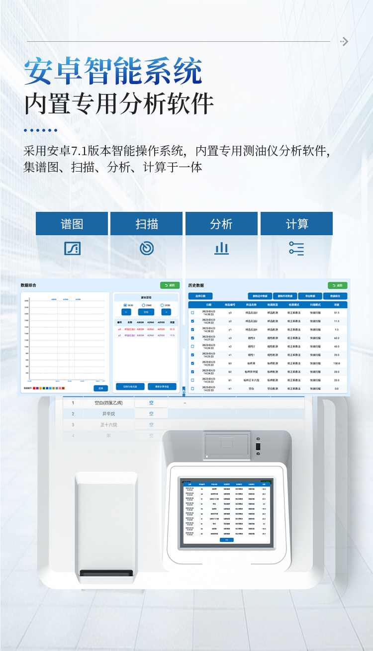 2.仪器采用安卓7.1版本智能操作系统,内置专用测油仪分析软件,集谱图、扫描、分析、计算于一体;