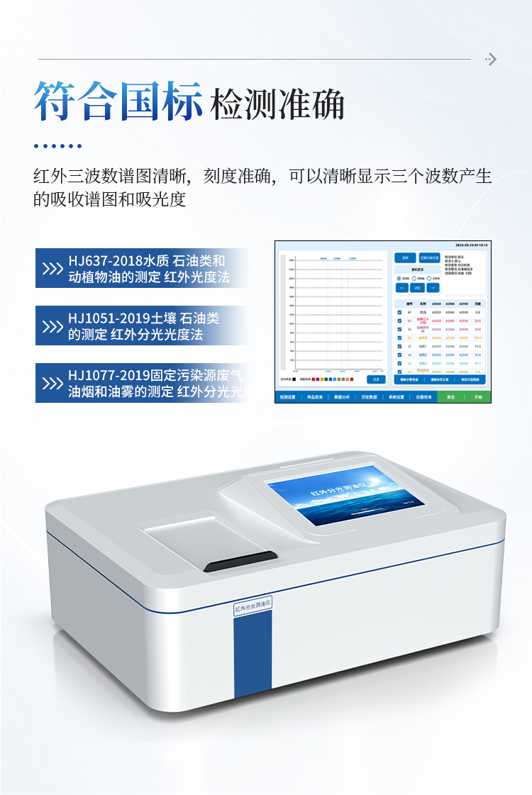 1.符合标准HJ637-2018,红外三波数谱图清晰,刻度准确,可以清晰显示三个波数产生的吸收谱图和吸光度;