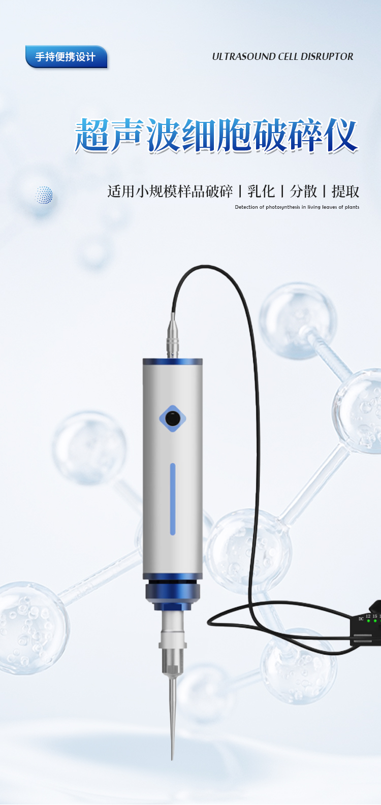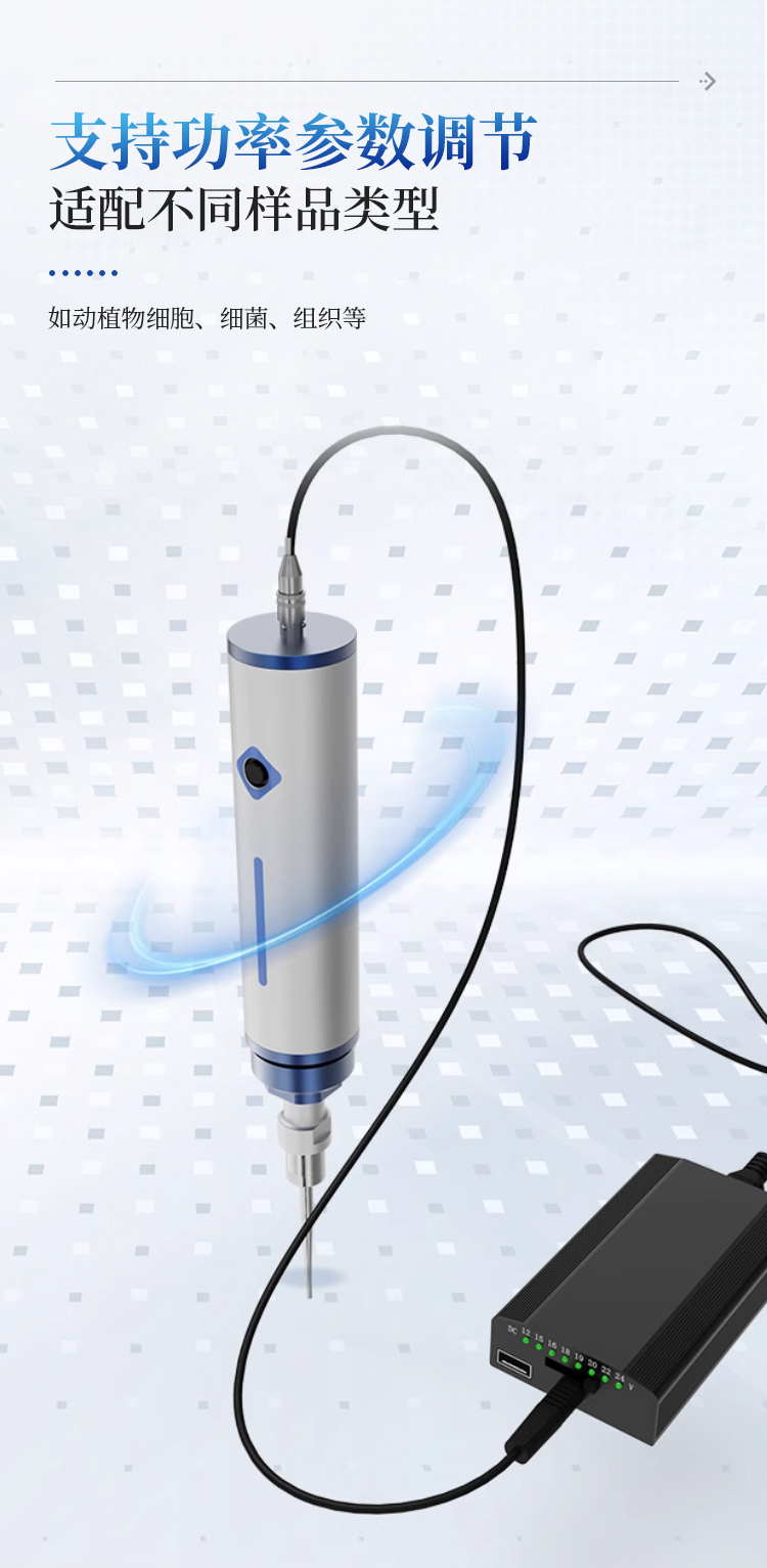 简要描述: 手持式超声波细胞破碎仪是一种便携式、高精度的超声波处理设备,适用于实验室小规模样品破碎、乳化、分散和提取等操作。其一体化设计集成了超声波发生器和换能器,操作灵活,可手持使用或搭配支架固定,适用于生物、化学、材料等领域的高效样品处理。