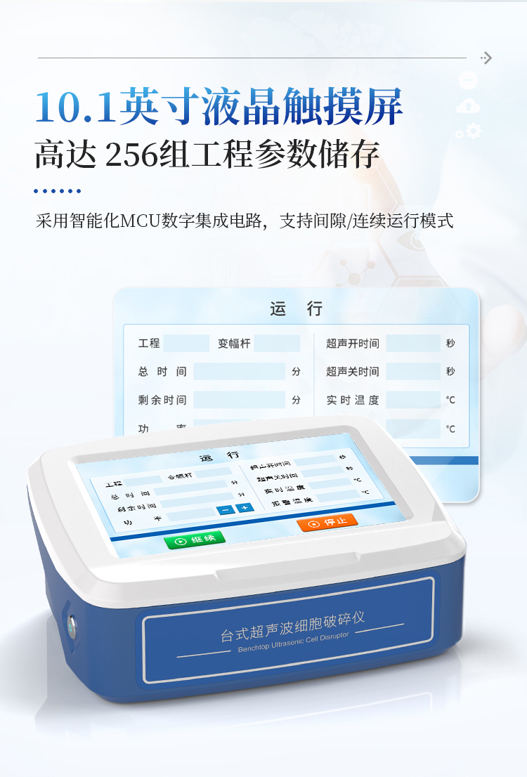自研自产的超声波细胞破碎仪。功能齐全、外观新颖、性能可靠。仪器采用大屏液晶显示;中央微机集中控制,超声输出、间隙时间、超声功率,样品温度监测显示,频率自动跟踪,故障自动报警等功能。适用于生物化学、微生物学、药物化学、表面化学、物理学、动物学、农学、医学、制药等领域的教学、科研及生产。