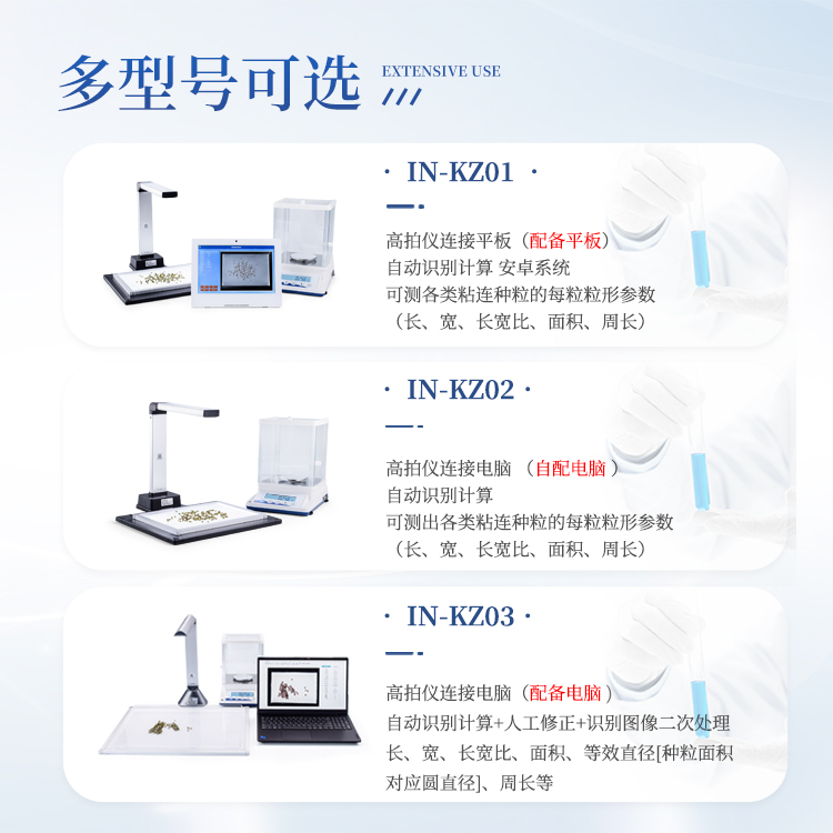 智能考种系统可以测量各种表面光滑的籽粒的数量、千/百粒重与平均粒型(包括长、宽、长宽比、周长、面积),利用图像ORC 识别技术、图像定位、空间转换等技术实现快速识别种子数量及作物性状指标。