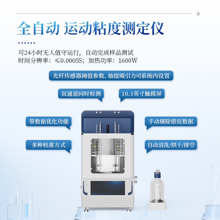 全自动运动粘度测定仪是按照GB/T265、ASTM D445的标准要求研制开发,用于测定液体、石油产品的运动粘度,结构设计精巧、美观、实用、操作舒适。一键快速恒温、油样上吸、粘度检测、粘度值计算、打印、粘度管清洗、烘干粘度管,不需要人工操作,仪器自动完成,一次可同时做2个样品的实验,提高工作效率;广泛应用于药典、石油、化工、科研、计量、商检、电力等部门。