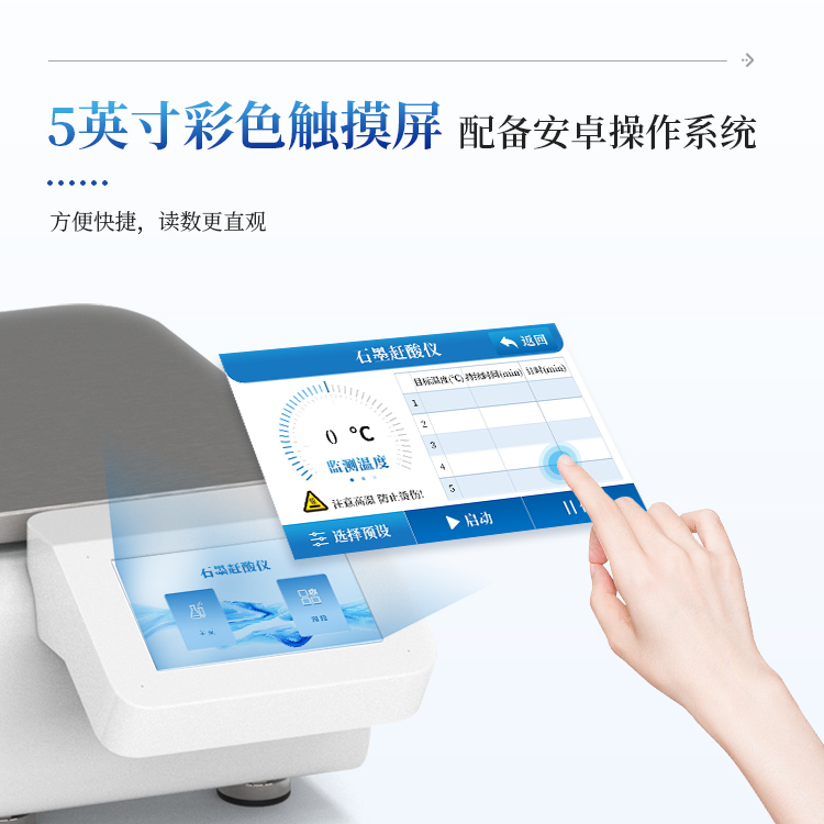 简要描述: 石墨快速消解仪采用优质高纯石墨材质,结合精确的环绕立体加热技术,确保消解孔间温差极小,有效保障了批量样品处理的平行性与结果准确性。智能PID温控系统支持高精度程序升温,用户可灵活设定并存储多组消解程序,操作简便,重现性极佳。同时,仪器具备超温保护、漏电保护等多重安全机制,配合耐腐蚀设计及友好的操作界面,在提升实验效率的同时,全力守护实验安全。