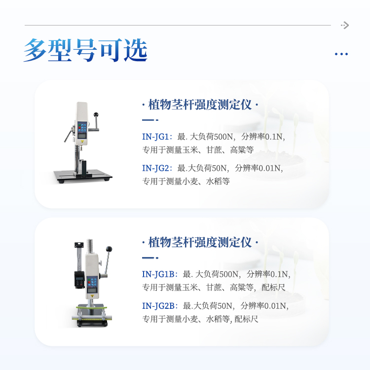 植物茎秆的强度是决定作物抗倒伏能力的一个主要因素,长期以来玉米,高梁、烟草等的倒伏给作物的机械收割造成很大的困难。从机械化水平来说,造成大量的粮食浪费。另外,作物倒伏导致光照不充分,使其生产量受到极大的限制。在作物生长的各个阶段对其茎秆进行活体测量,进而根据茎杆纤维层的抗弯阻力与抗倒伏能力的相关性对群体测量数据进行统计处理,对作物的栽培和育种具有重要意义。植物茎秆强度仪采用拉压力传感器,通过针刺、压碎、折断的方式测出茎秆断裂或者屈服瞬间产生的最大力,即茎秆的强度。