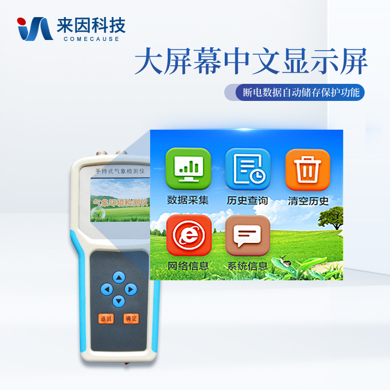 大屏幕中文液晶显示,全程跟踪记录各个被测环境因子的数值、组数、低电压示警,主机内置大容量存储器,可储存三十万条数据,具有断电数据自动存储保护功能。