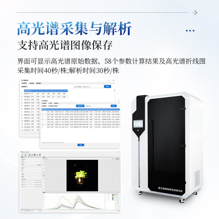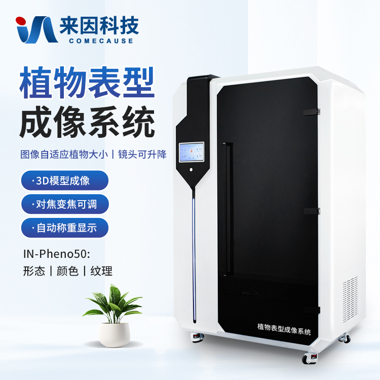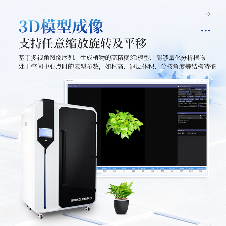 植物表型成像分析系统是主要用于对植物表型进行测量与分析的设备。系统分别在顶部、侧上方以及侧下方设置了可见光成像单元,根据底部旋转台设备的转动进而获取植物全方位的表型信息。系统使用了以人工智能为基础的三维成像技术,以多视角结合的方式动态生成植物的三维模型,并且可以根据模型计算植物的株宽、株高、骨架、ASM、SSIM等形态、颜色、纹理参数。适用于分析禾本科、茄科、十字花科、豆科等植物,主要用于植物生理学、生态学、环境科学、植物保护等领域。